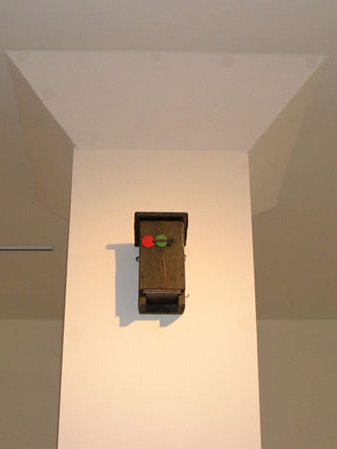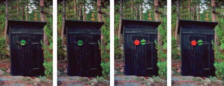 The first outhouse on my family's summmer property in the Finnish archipelago was built by my grandfather in the 1950s, with a special manual door latch that turns from green to red to indicate that the outhouse is occupied. My grandfather was also an avid amateur ornithologist and had many birdhouses up on our property which needed to be cleaned out every summer so that new birds would next there the following year. I have taken on this job myself now, and once while doing it I realized how much the outhouse and the birdhouse resemble one another as structures. By adapting a door latch for the birdhouse, the two structures are now able to signal each other in a kind of forest semaphore.